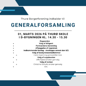Se dagsorden her: http://www.xn--thurborgerforening-j4b.dk/wp-content/uploads/2026/01/Moedeindkaldelse-til-Generealforsamlingpng.png